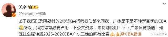 北京时间12月11日,根据广东体育频道记者“关辛”的报道,“鉴于我妈以及隔壁村的刘关张宗祠师叔伯都来问我,广体是不是不转新赛季的CBA[允悲]所以,我觉得有必要占用一下公共资源,来特别说明一下:广东体育频道一如既往全程转播2025-2026CBA广东三雄的所有比赛”