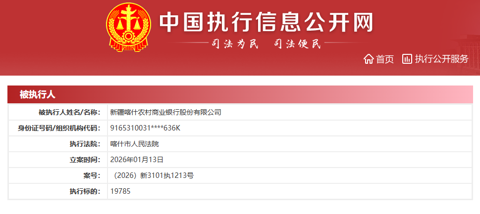 城市头条讯 据中国执行信息公开网公示,新疆喀什农村商业银行股份有限公司(统一社会信用代码:9165310031****636K),于 2026 年 1 月 13 日被喀什市人民法院列为被执行人,案号(2026)新 3101 执 1213 号,执行标的 19785 元。