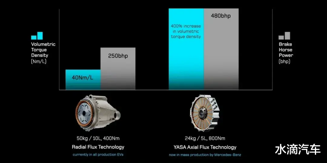 2025 年10月,YASA发布研发的轴向磁通电机的原型机,核心单元仅重12.7公斤,能爆发出的峰值功率是750千瓦(超1006hp)的最大功率,功率密度达到59kw/公斤。单台电机的持续输出功率350–400kW,注意这是单个功率,这个重量和体积可以很轻松做成4电机布局。长度可以缩小到1/3,重量可以减轻到到1/3。