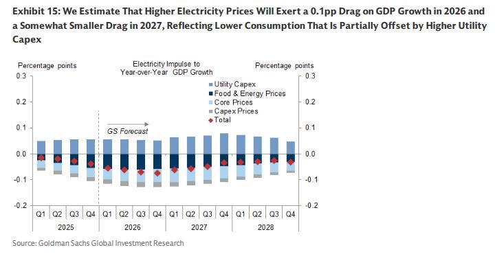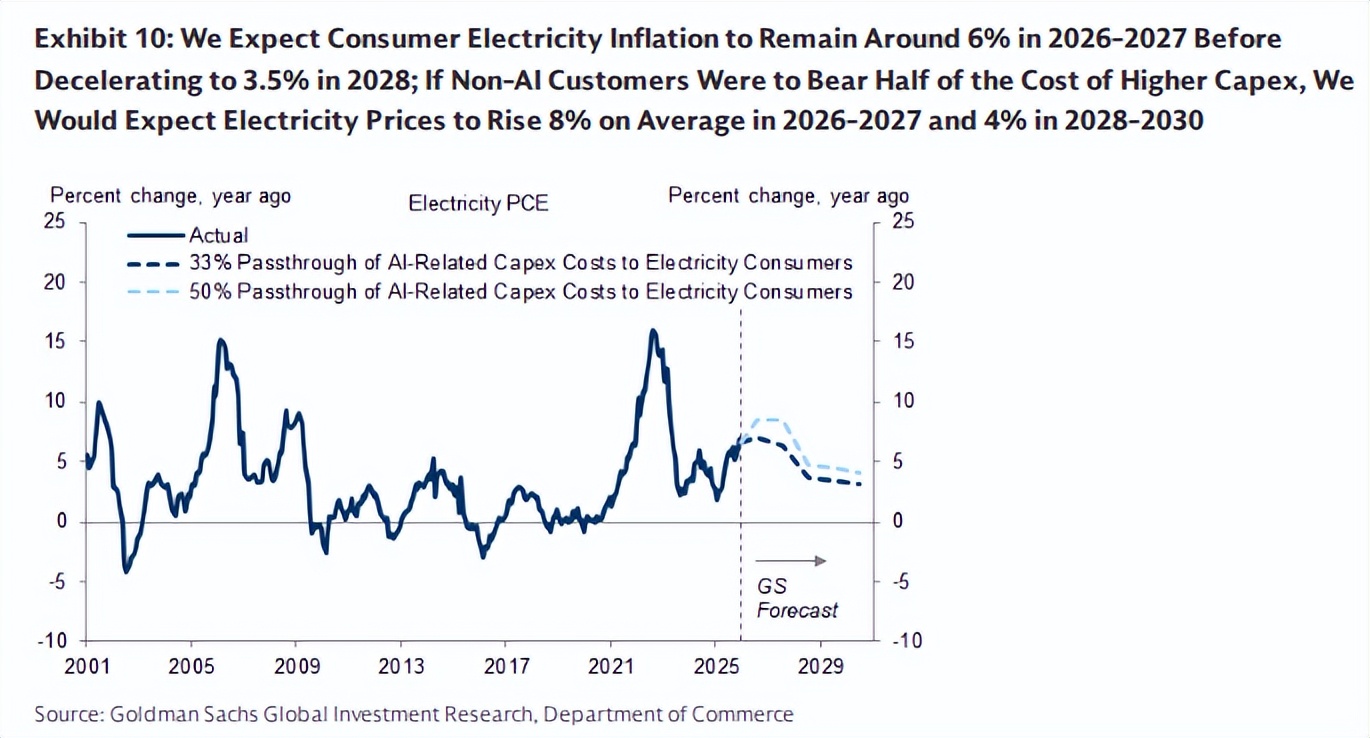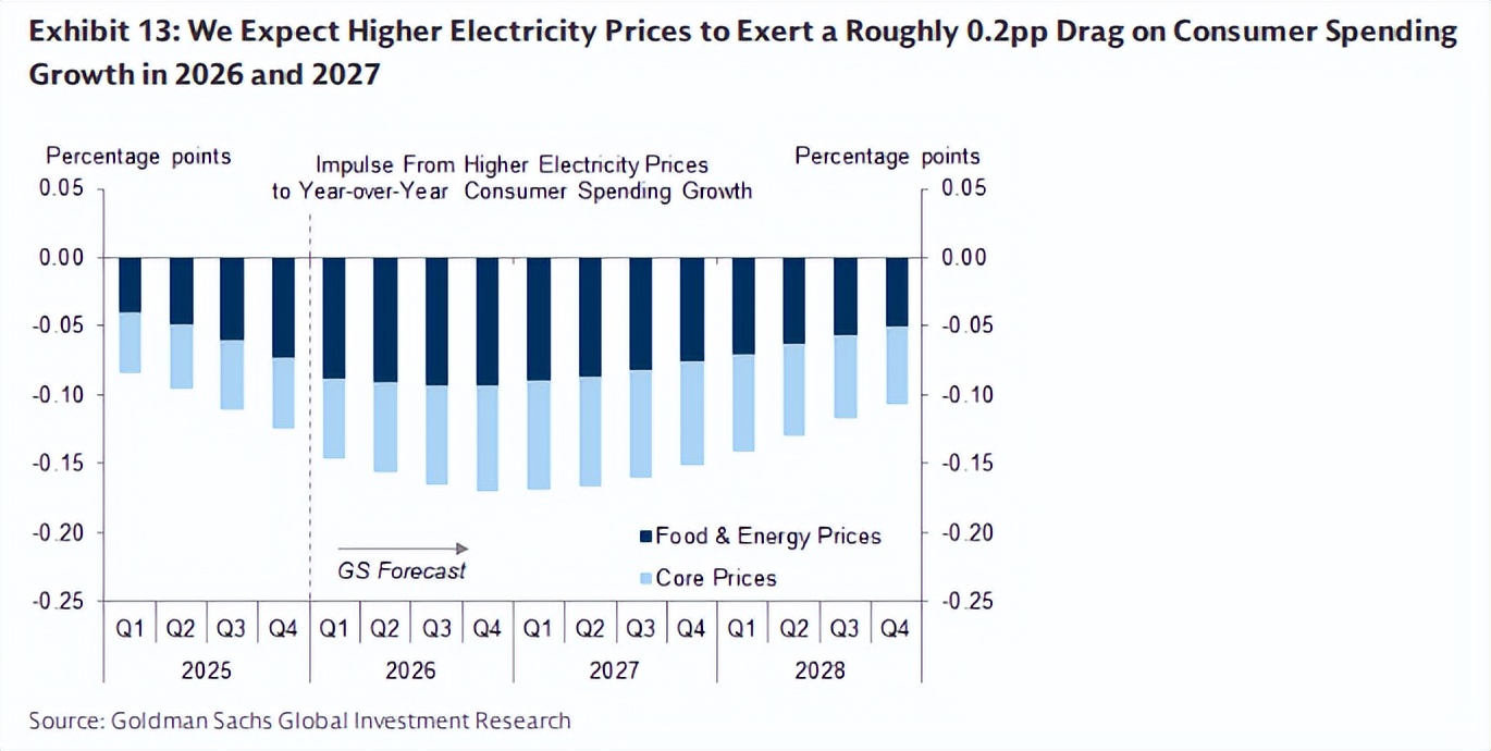 高盛预计,2026/2027/2028年电价上涨将直接推高总体个人消费支出(PCE)通胀率0.1/0.07/0.05个百分点。