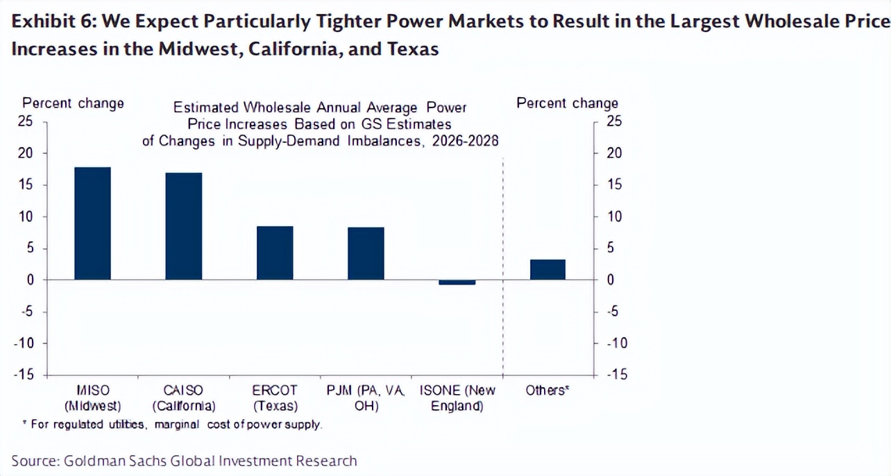 在图表6中,高盛将上面发现的经验关系与高盛的电力策略师对未来几年电力市场紧张程度变化的估计相结合,这些估计基于他们对数据中心相关电力需求相对于各地区计划新增供应量增长幅度最大的预期。高盛的结果表明,电力市场紧张可能会使中西部、加利福尼亚州、德克萨斯州和大西洋中部地区的批发电力价格上涨幅度远大于美国整体水平。
