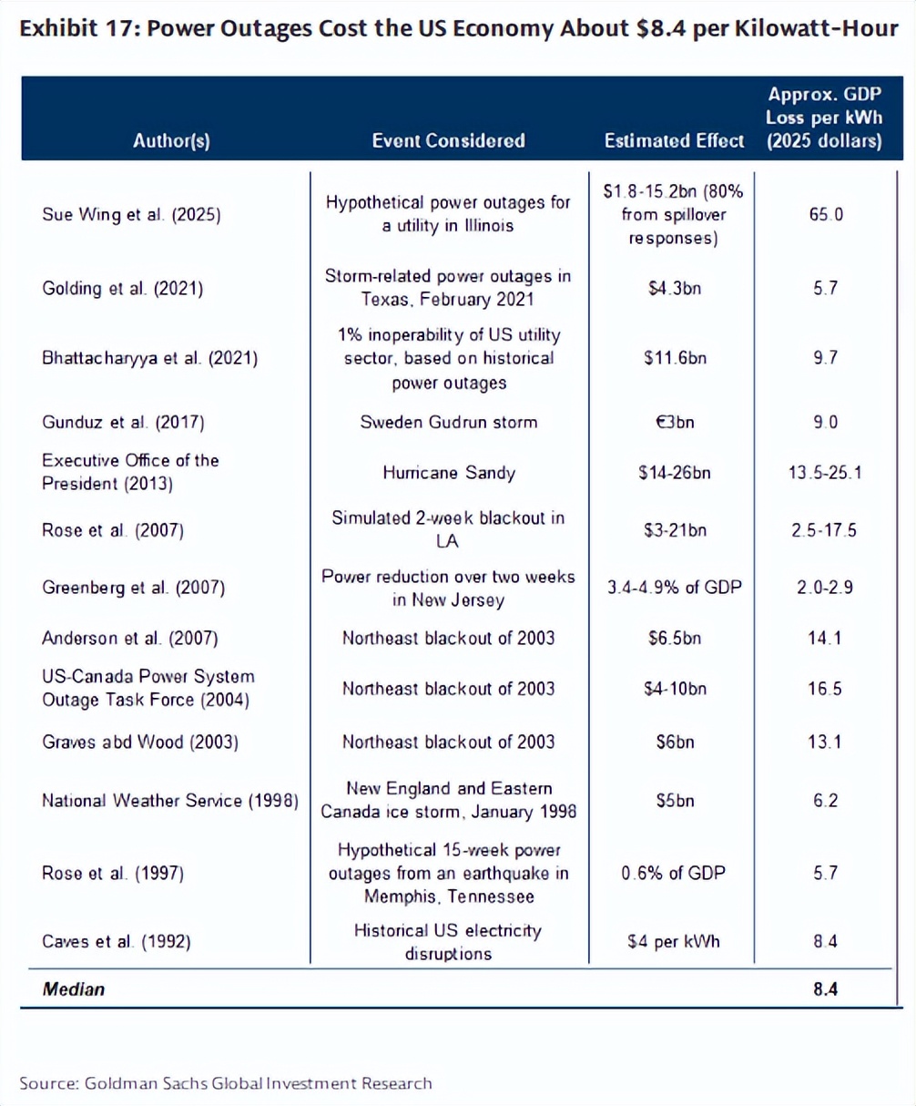 高盛认为,高盛的预测面临两方面的风险。一方面,更节能的数据中心、更快的电力供应增长或需求放缓(例如,一些公司建立自己的发电“孤岛”以完全绕过电网)将导致电力市场供应紧张程度降低,从而减少对经济增长的拖累。另一方面,持续的供应短缺或人工智能的加速应用将导致更大的拖累。如果电力市场紧张导致停电持续时间或频率增加,产出损失将大幅增加。图表 17 显示,美国经济因停电造成的损失约为每千瓦时 8.4 美元——几乎是居民用户平均电价的 50 倍。