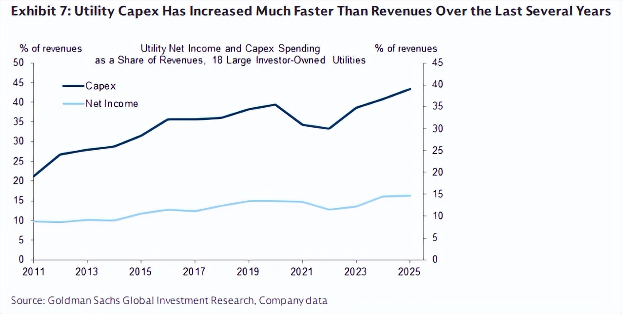 其次,高盛预计,由于上文所述的供需失衡,公用事业资本支出将大幅增加。由于公用事业公司通常从投资资产中获得预设的投资回报,而这通常通过提高电价来弥补(高盛将在下文进一步讨论),因此更高的资本支出可能会推高电价。