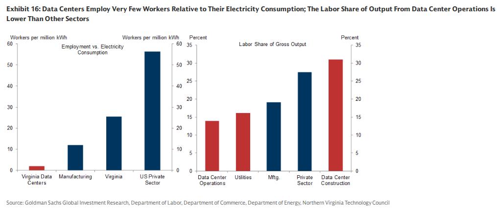此外,由于数据中心雇佣的员工相对较少(图表16左侧),且数据中心运营的劳动产出占比很低(图表16右侧),高盛预计数据中心运营带来的劳动收入不足以抵消这些地区电价上涨带来的大部分影响。
