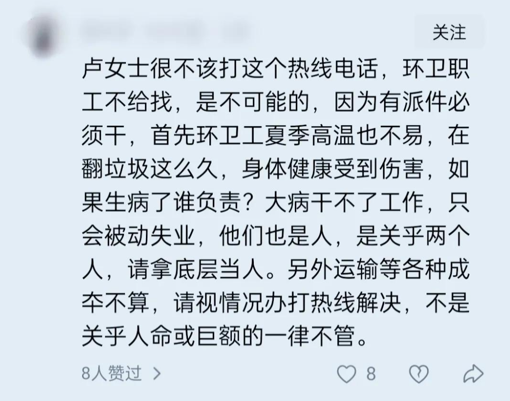 高温高危作业本非环卫工职责,这份额外的苦痛付出,竟被用作自我感动的注脚。若她心底存一丝对他人的体恤,怎会按下那个求助电话?这不是无心之失,是骨子里对他人付出的廉价认知。