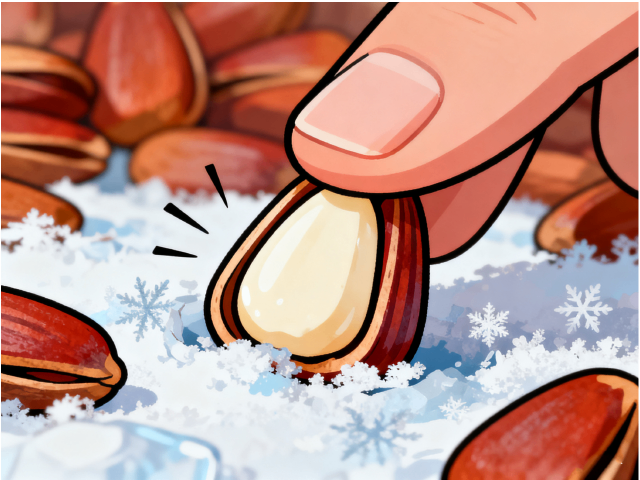 拇指轻抚条纹铠甲,“咔嚓”奏响冰雪圆舞曲,乳白果仁如雪貂探头,齿尖迎来的先是松木清香,随后化作奶油般绵长尾韵。
