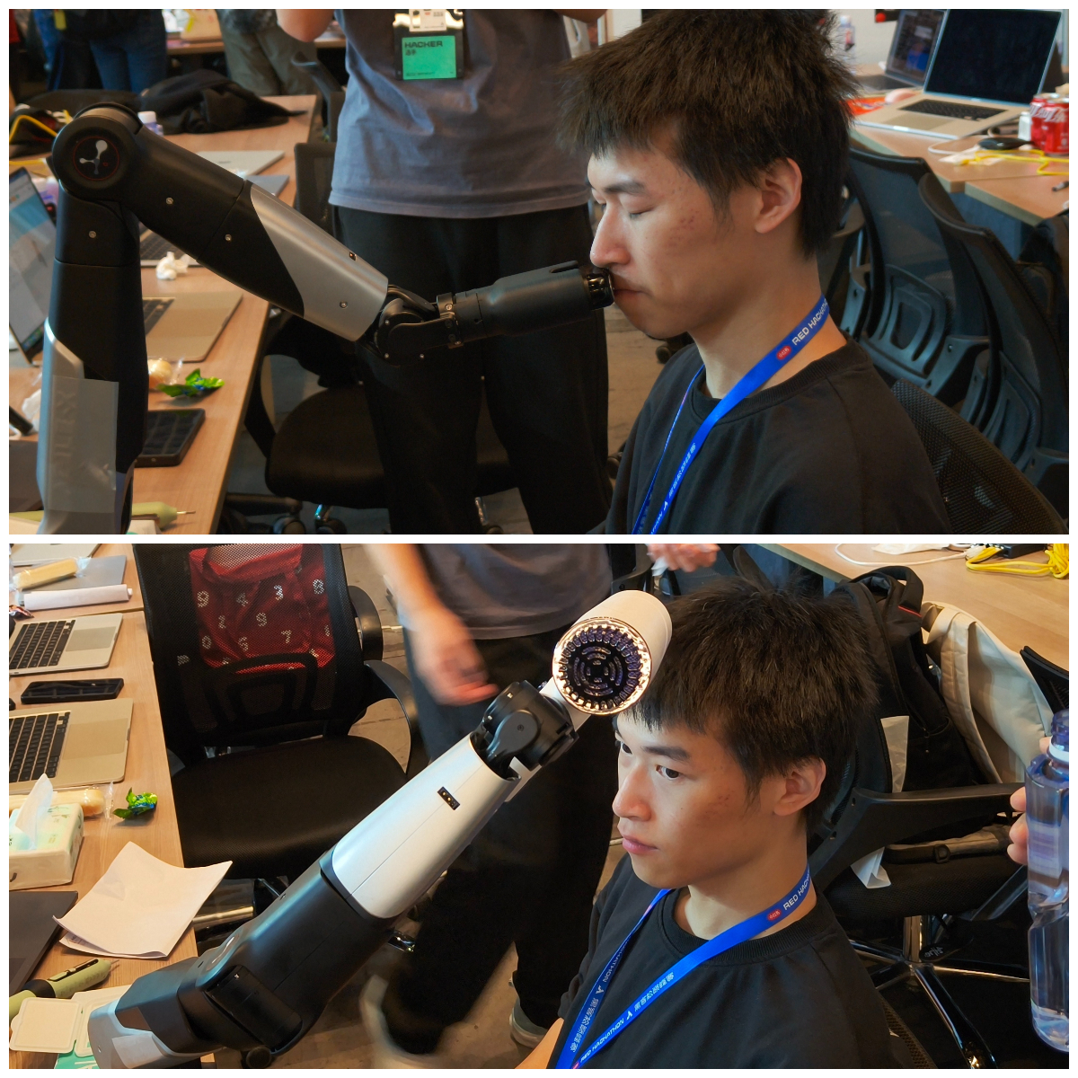 另一组团队的产品「TRI.ME 吹了么」则把机械臂和摄像头搬进了卫浴场景。吹风机、剃须刀、牙刷都可以接在这只机械臂上,根据不同模式执行不同动作。吹头发的时候,它会自动追踪头部位置,摄像头识别头发状态,判断什么时候可以停下来: