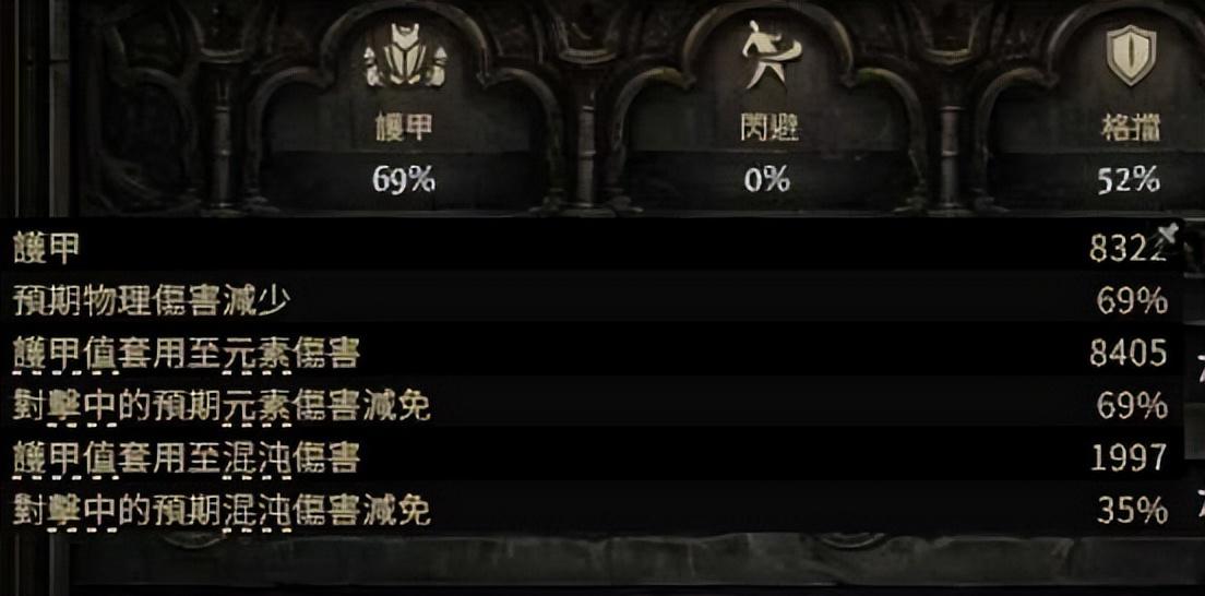 防御方面:因为盾墙需要使用护甲盾牌,所以整体防御体系是围绕着护甲和格挡来的。装备尽量选择高护甲装备。这赛季加入了护甲作用于元素伤害和混沌伤害的词条。虽然比不上一代的超然飞升。也算是有不小的提升。格挡虽然降低了上限,但是可以格挡所有击中伤害。整体来看算是加强了。目前我有8000的护甲和52的格挡上限。并且护甲百分百套用元素伤害,30%套用混沌伤害。