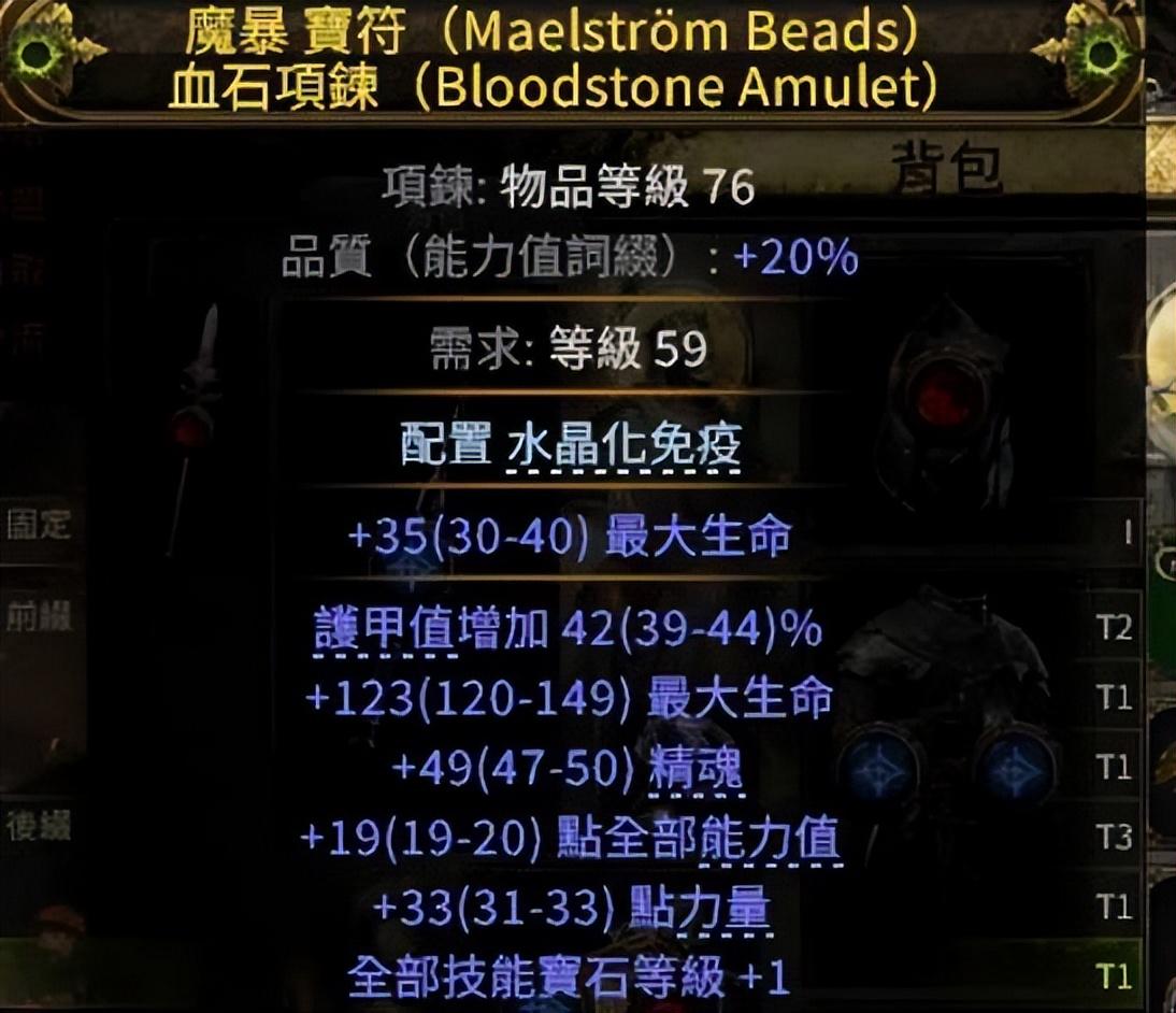 项链:高精魄高血量项链,后缀缺抗补抗,注意要空一条后缀用深渊亵渎做出所有技能加一。提升放屁的等级。