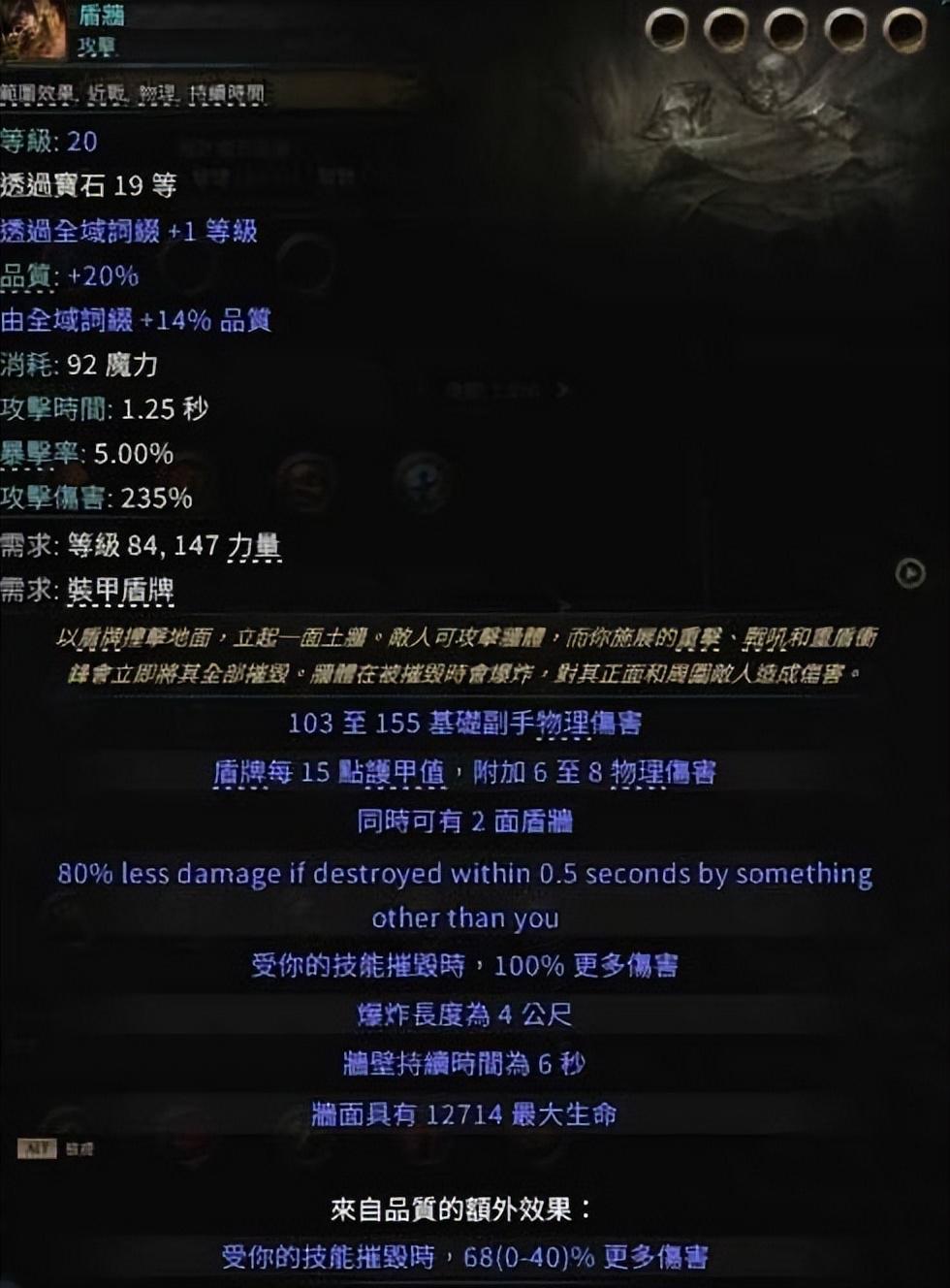 启动充能手段:我目前是选择盾墙这个技能作为启动充能手段的,盾墙自带基础物理点伤,并且盾牌的护甲能够附加点伤。伤害倍率235%,使用盾冲引爆还能提高最高168%MORE伤害。并且神奇的是放屁也可以引爆盾墙。因此除了第一次使用盾冲引爆盾墙给放屁充能外,