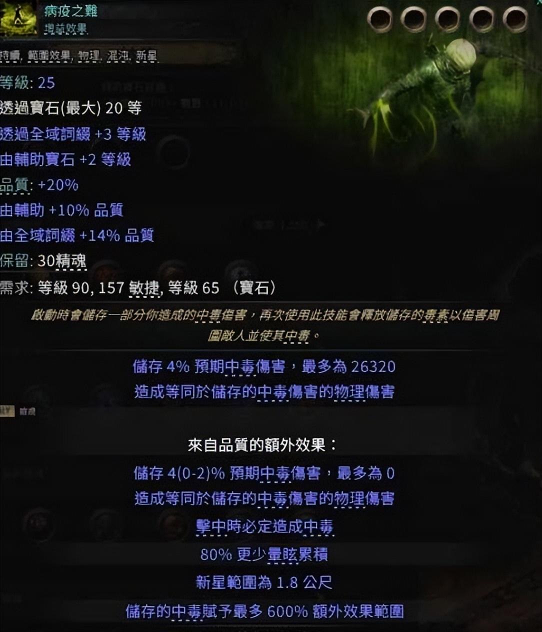 技能等级可以提高存储中毒量,收益非常高,它不属于攻击或者法术技能,有混沌和物理标签,因此可以通过全部技能等级、混沌或者物理技能等级来提高伤害。