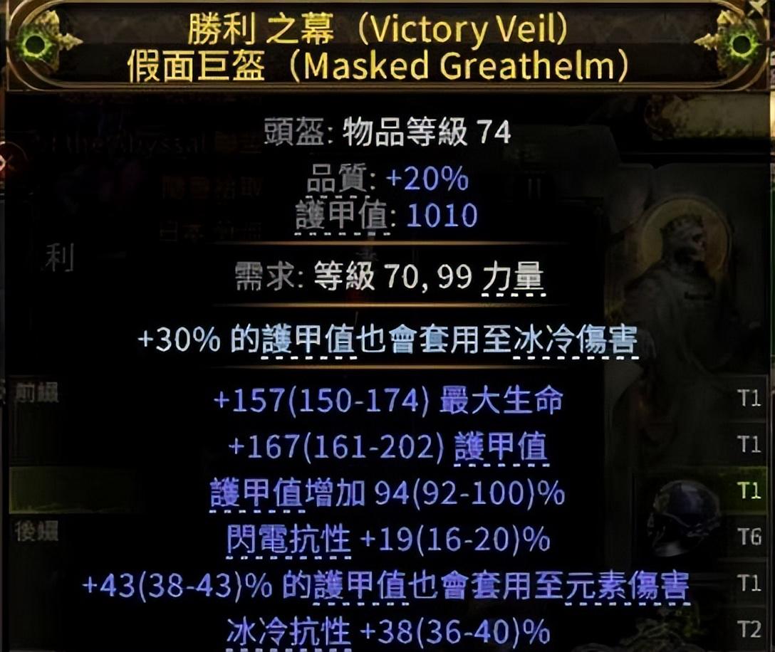 头盔:同样是护甲和生命越高越好,后缀找抗性和护甲作用元素伤害。
