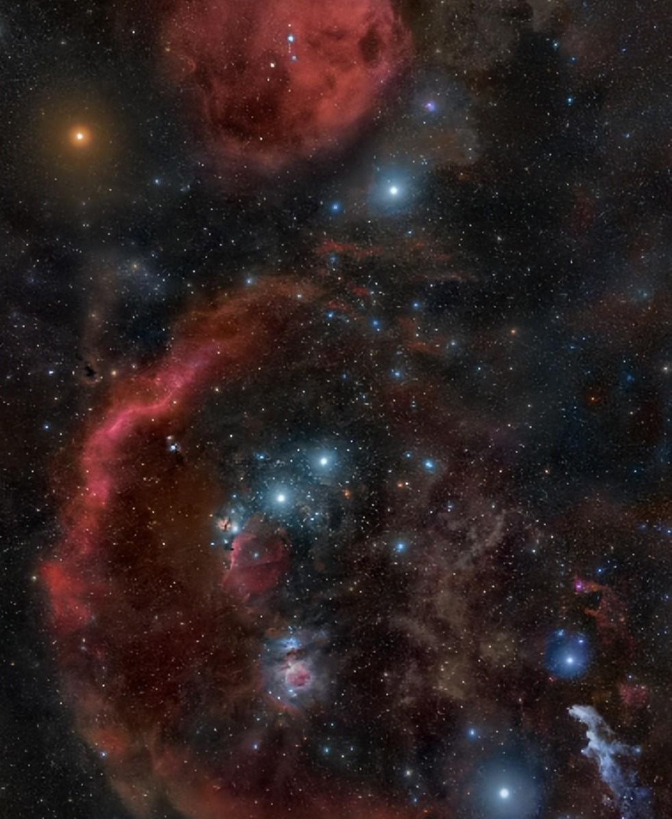 参宿四比太阳大16倍,这颗红色的恒星还具有令人难以置信的亮度,其3600开尔文的低温表面赋予了它独特的红褐色,但它在548光年的距离外发出了我们的恒星12.6万倍的惊人光亮,这么高的亮度使其我们可以用肉眼直接看到它,仅在可见光中就发出其总辐射13%的能量,如果我们能感知所有波长的光,那么参宿四就会比我们夜空中最亮的恒星更亮。