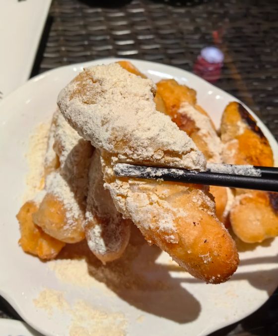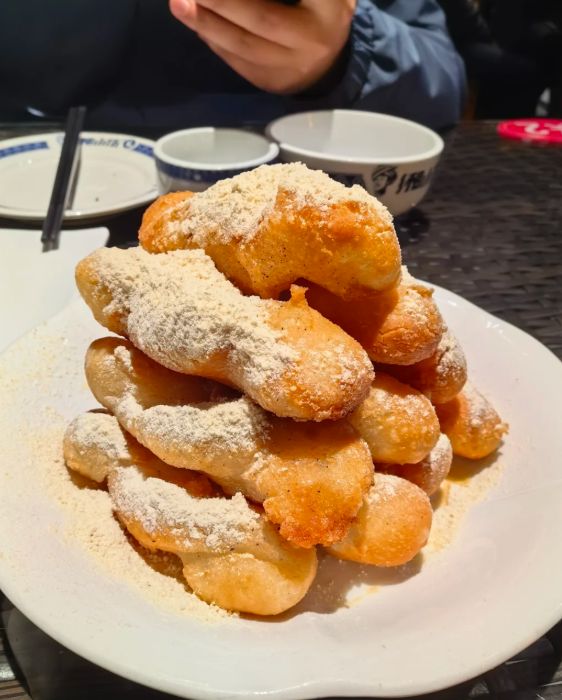 黄豆粉是糖饺子的点睛之笔。黄豆要炒熟,磨成细细的粉末,加上白糖拌匀。刚炸好的糖饺子表面还带着油温,裹上黄豆粉后,粉就牢牢地粘在上面了。咬一口,外面的黄豆粉香甜细腻,接着是酥脆的外皮,再往里是软糯Q弹的糯米,三重口感在嘴里层层展开。甜味来自黄豆粉里的糖,不会太甜,恰到好处地衬托出糯米的香。