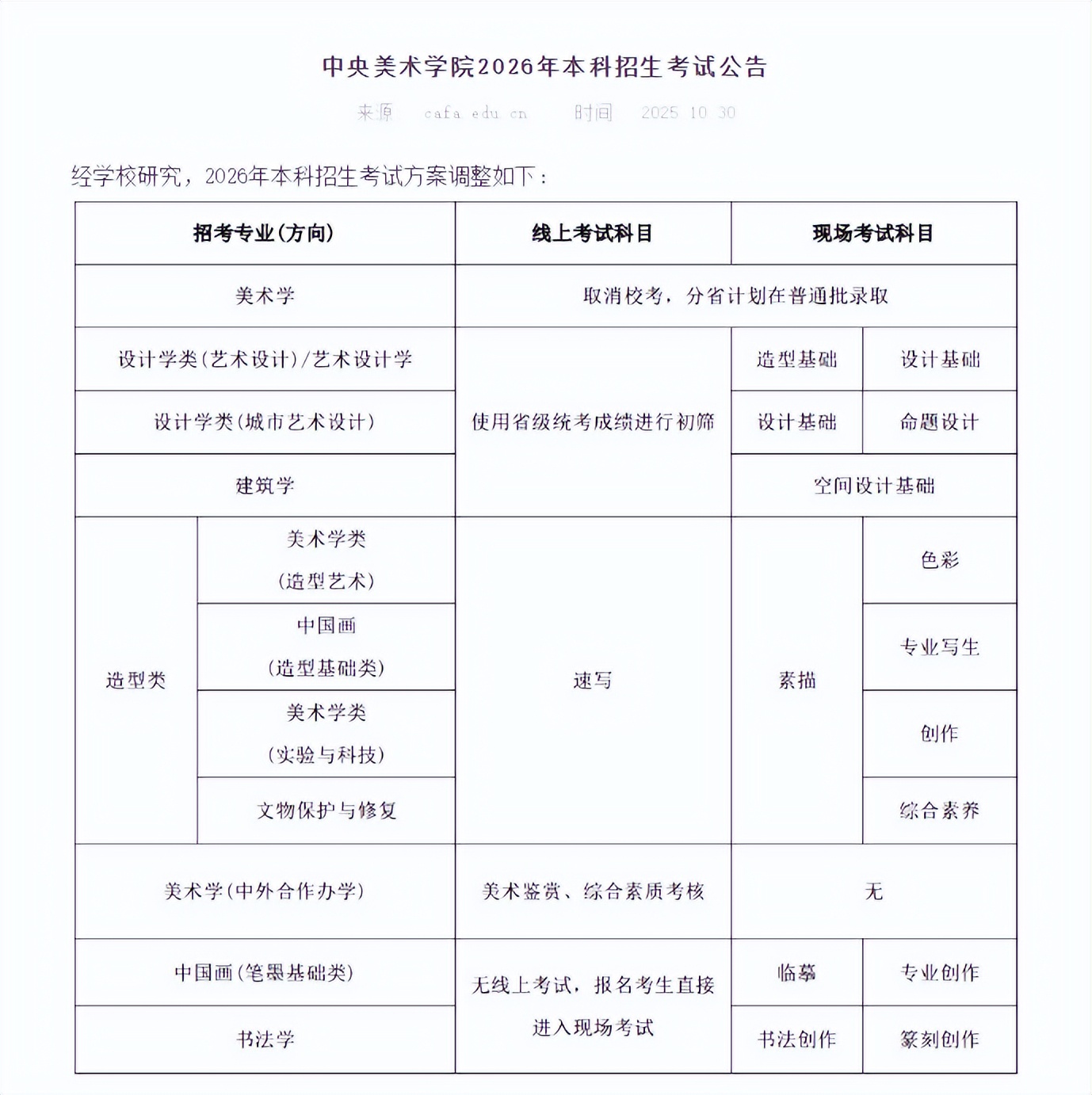 近日,中央美术学院(以下简称“央美”)发布了《中央美术学院2026年本科招生考试公告》,对招考有调整,美术学专业取消校考,艺术设计等专业使用省级统考成绩进行初筛。
