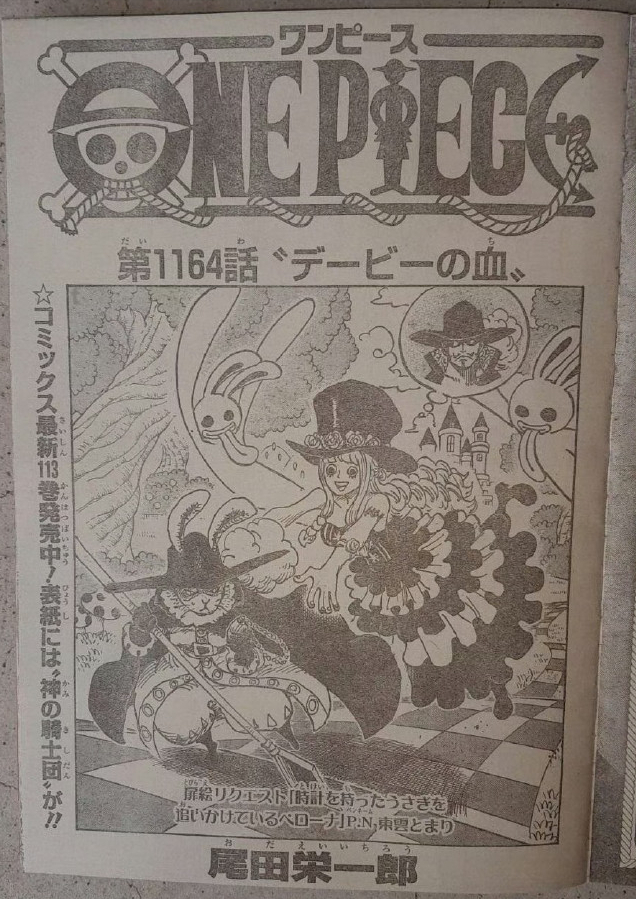我们知道本周即将更新海贼王最新一期的漫画1164话,本话标题为“戴维一族”,扉页是幽灵公主佩罗娜想要抓一只和鹰眼很像的兔子!