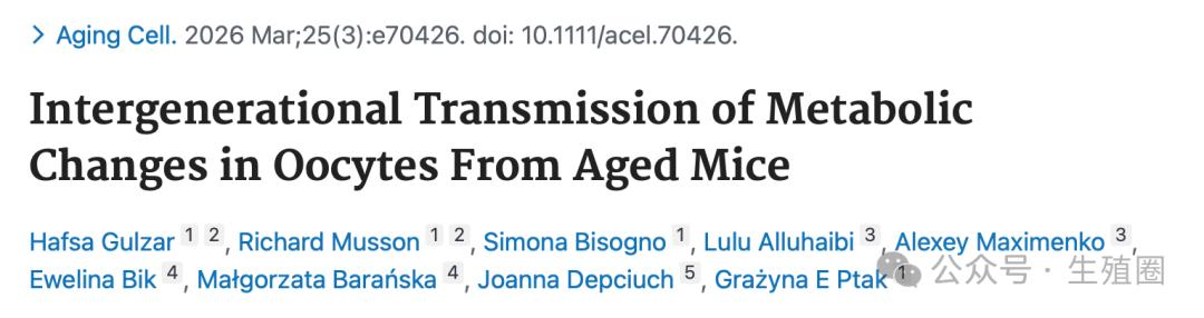 Intergenerational Transmission of Metabolic Changes in Oocytes From Aged Mice. Aging Cell. 2026 Mar;25(3):e70426. doi: 10.1111/acel.70426.