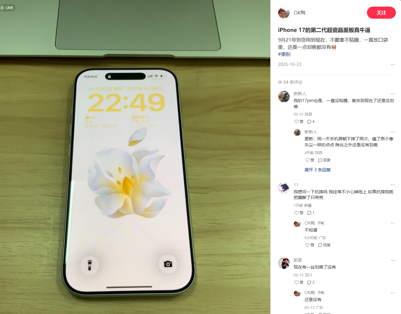 在国内,广大“贴膜党”对 iPhone 17 的耐用性也开始了从怀疑到“真香”的转变。小红书上,有网友就分享从去年到现在都没有划痕。