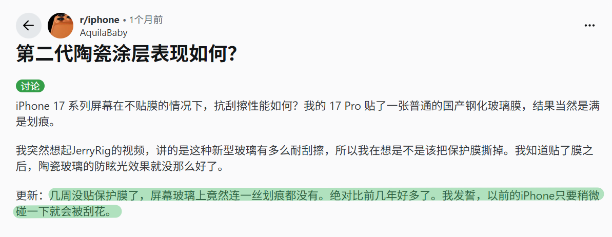“我的 17 Pro 完美无瑕,从上市就一直用到现在一点划痕都没有。跟我的 15 Pro 比起来简直天壤之别,15 Pro 轻轻一看就容易刮花。”