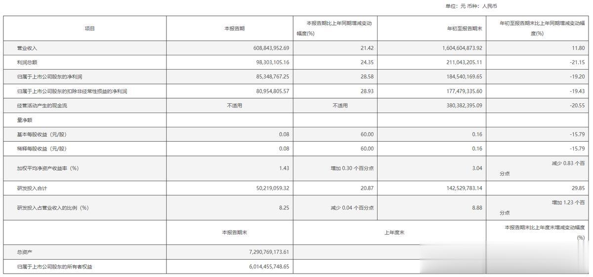 2025年前三季度公司实现营业收入1604604873.92元,同比增加11.8%;实现归属于母公司所有者的净利润为184540169.65元,同比减少19.2%;实现归属于母公司所有者的扣除非经常性损益的净利润177479335.60元,同比减少19.42%。