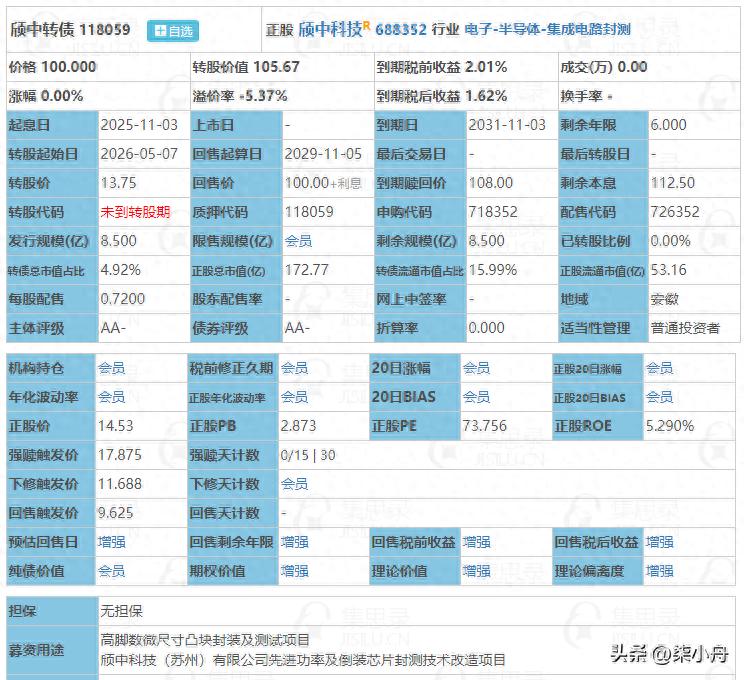 正股颀中科技(688352)最近一个交易日(10月31日)的股价为14.53元,转股价为13.75元,转股价值为105.67。转股价值较高。