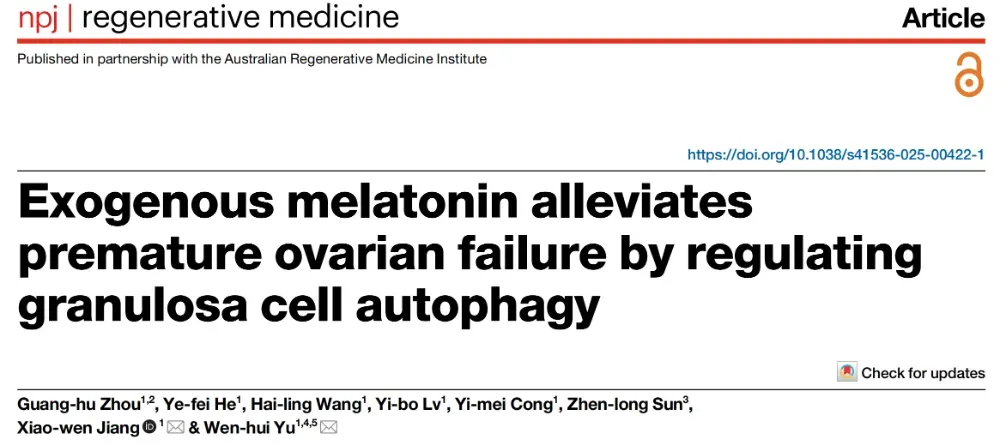 在此背景下,2025年8月,“npj Regenerative Medicine”杂志发表了一篇题为“Exogenous melatonin alleviates premature ovarian failure by regulating granulosa cell autophagy”的研究文章。该研究聚焦于外源性褪黑素对POF的潜在治疗作用,通过调节颗粒细胞自噬来改善卵巢功能。褪黑素作为一种广泛存在于生物体内的内源性激素,具有抗氧化、抗炎和抗凋亡的特性。近年来的研究表明,褪黑素在多种疾病中具有潜在的治疗作用,但其在POF治疗中的应用尚处于探索阶段。本研究通过构建POF小鼠模型,系统评估了外源性褪黑素对卵巢功能的改善作用,揭示了褪黑素通过调节颗粒细胞自噬来减少凋亡的新机制,为POF的治疗提供了新的靶点和潜在策略。