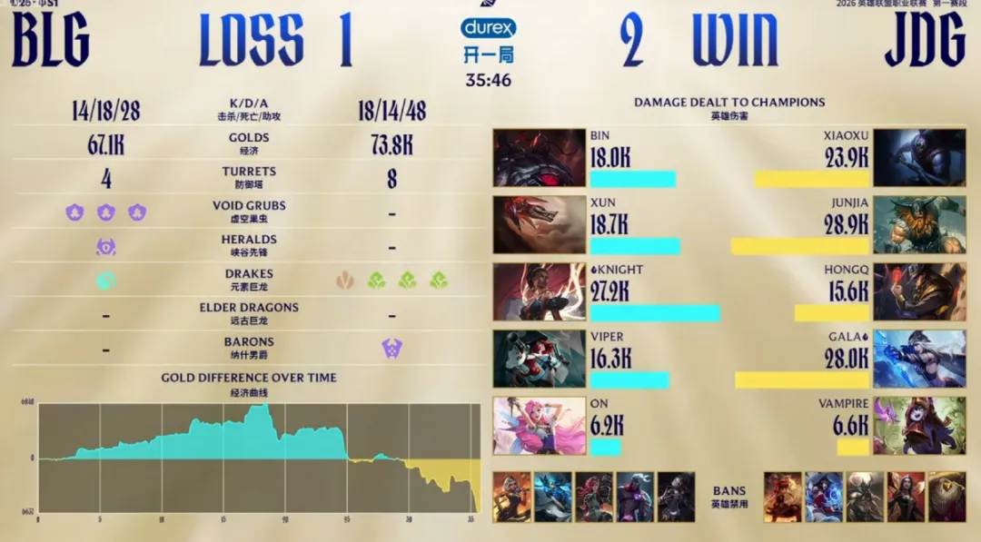 第三局同样是BLG前期获得巨大领先,中路左手几乎超神,结果又是自身出现了问题,先是on数次阵亡掉点导致节奏断档,随后又在五打四的情况下,被JDG打野junjia的奥拉夫砍出了缺口,向死而生越砍越猛,把BLG都砍乱了阵脚。其他三局BLG也均在对线期就取得了优势,对线期一结束就是领先几千经济,硬实力这块BLG肌肉还是太大了。