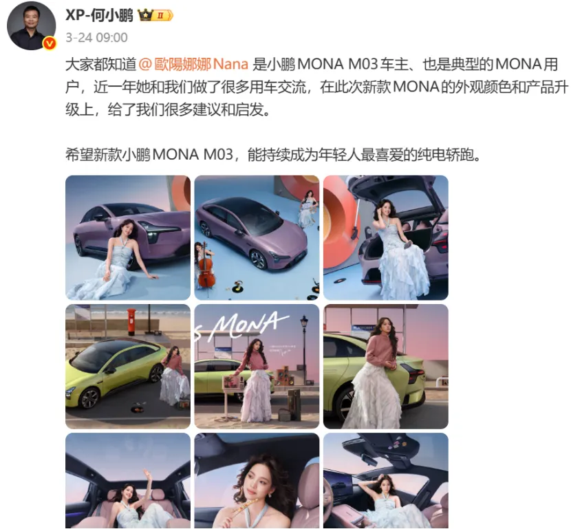 比如欧阳娜娜购买小鹏MONA近一年,品牌采纳其反馈在今年车型改款时,新增了牛油果绿、罗兰紫等更满足少女心的配色,将小鹏MONA M03产品升级成最受年轻人喜爱的纯电轿跑。