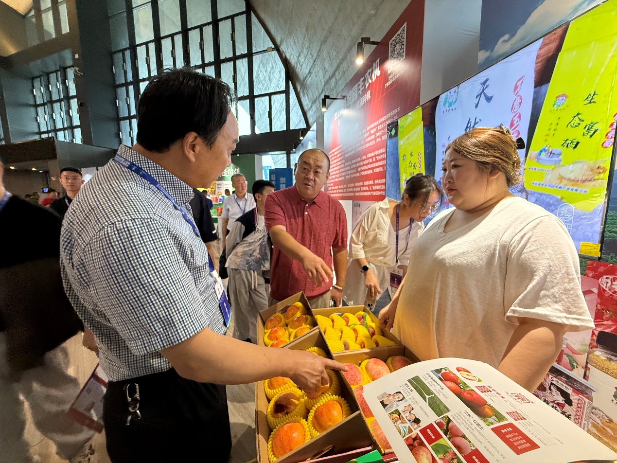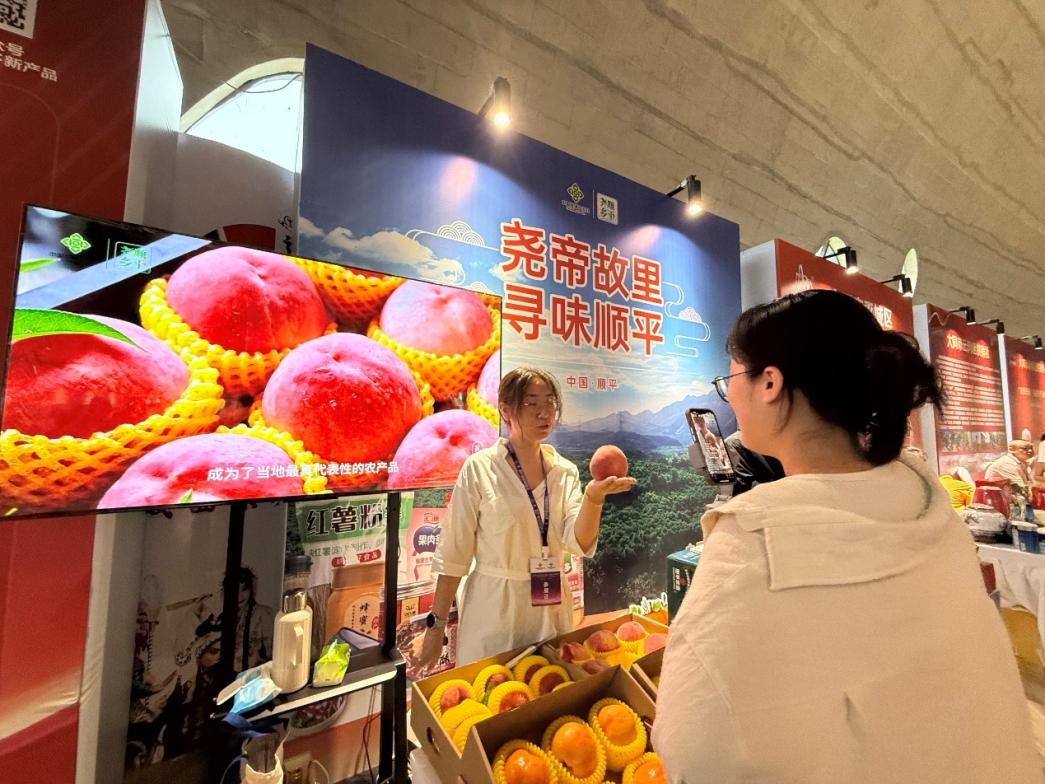 水蜜桃、黄油桃、蟠桃等应季鲜桃琳琅满目,色泽诱人、果香四溢,纯天然蜂蜜、山地黄小米、玉米糁、果冻玉米糁、白马牙玉米糁、非转基因老黄豆,以及融合传统工艺与现代需求的非遗布鞋等地方特色产品,全方位展示顺平丰富的特色产品资源和独特的文化底蕴。顺平县供销合作社组织的12种特色产品吸引了众多客商驻足品鉴和咨询洽谈。