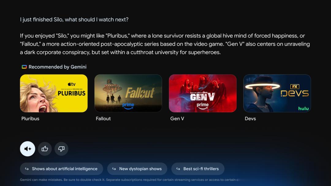 谷歌相信人工智能能提升电视观看体验,因此在去年十一月将旗下的Gemini AI引入Google TV设备。