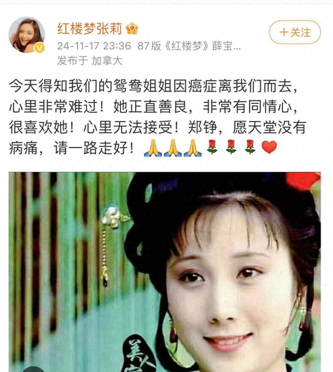 关于郑铮去世的原因,其好友张莉(薛宝钗扮演者)在前几日告知,郑铮老师不幸患癌,当时郑铮老师还处于重病阶段,但张莉在群里看到消息以为她去世了,为此还特意发了两条动态澄清,也一直为郑铮祈福,愿她早日康复。