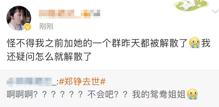 粉丝还告知,郑铮老师去世后,她的群被解散了,粉丝当时还疑问怎么就突然解散了,难以相信也不愿意接受这样的事实。