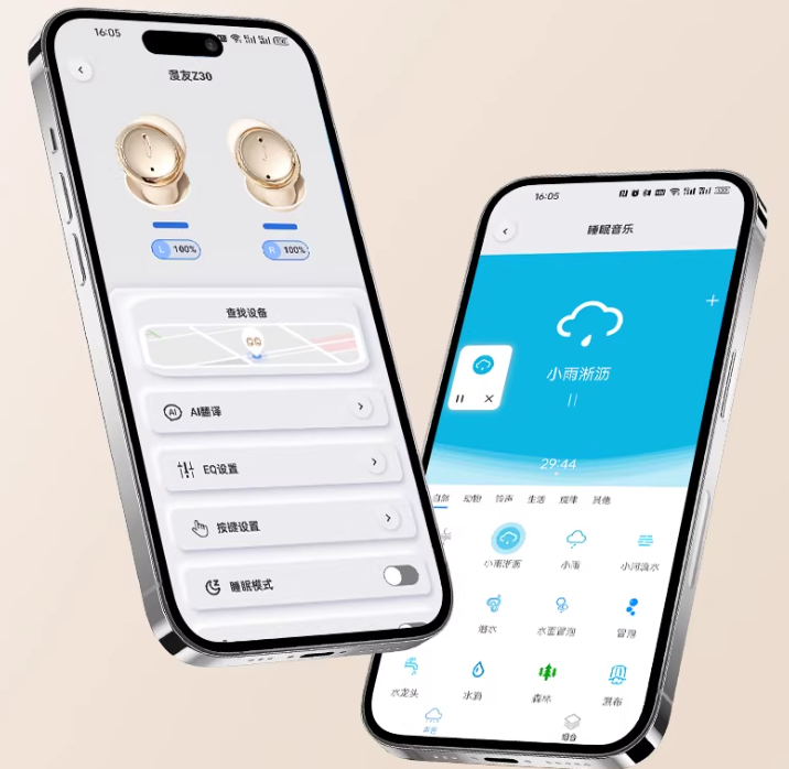 选睡眠耳机,优先挑支持APP连接的款。连上网APP之后,不光能方便地调耳机的各种设置,还能解锁超多专属的白噪音、自然音效,比如雨声、海浪声、树林里的风声这些,都是专业调过的,放松身心、遮环境噪音的效果特别好。而且APP一般还有定时关闭、音量慢慢变小这些适合睡觉的功能,选这种能连智能APP的,用起来更合自己的心意,助眠也更管用。