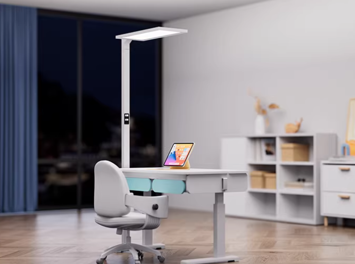 ①高亮度照明。这款灯的桌面平均照度达到1415lx,确保儿童学习全程沐浴太阳光,避免长期昏暗环境造成的视疲劳。