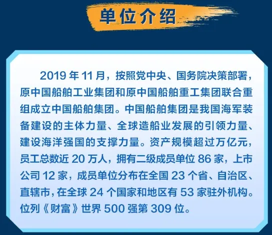 【企业简介】 中国船舶集团有限公司(CSSC),作为中国船舶工业的重要支柱,自1999年成立以来,始终坚持创新驱动发展战略,不断推进技术进步和产业升级。集团不仅在传统的民用船舶制造方面有着深厚积淀,在海洋工程、动力装备等领域也取得了长足的发展。截止到2023年底,CSSC已经在全球范围内建立了多个研发中心和技术合作基地,形成了从研发设计、生产制造到售后服务的完整产业链条。公司总资产超过5000亿元人民币,员工总数突破10万大关,其中专业技术人员占比高达30%,为企业的持续发展提供了坚实的人才基础。