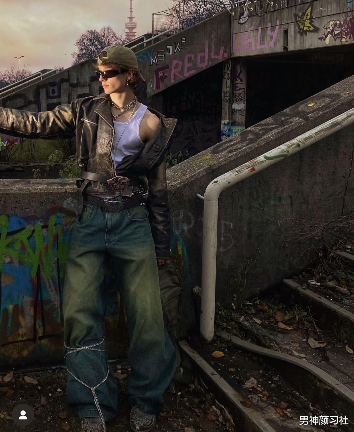皮衣搭配背心也是很多人会用的套路,微微露出胳膊的一边,会让你看上去更有野性。他也是对各种配饰来者不拒,从项链到脚链都有戴上,非常有存在感。