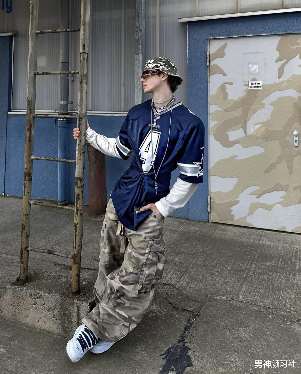同样是球衣,他还玩过另外一身穿搭。也是蓝色球衣和白色长袖的组合,不过他用了一个别针,瞬间就有了比例和街头感,真的是挺厉害的。迷彩裤也尽情拿出来穿好吗,都是会放大你优点的。