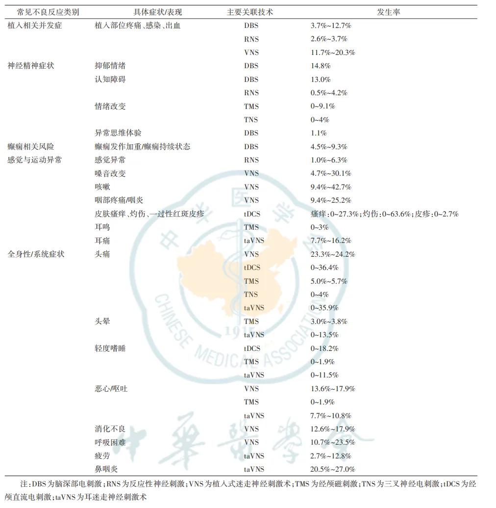 DBS、RNS和VNS的常见不良反应与刺激器植入和局部刺激相关,包括植入部位疼痛、感染或出血。VNS还可能诱发声音改变、咳嗽和咽部疼痛。特别值得关注的是,DBS治疗过程中存在诱发抑郁情绪和认知障碍的风险,需重视临床识别和早期干预。