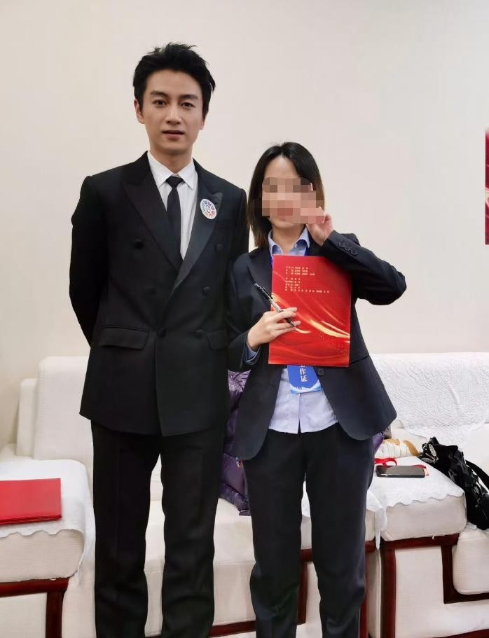 与现场工作人员的合影中,陈晓笔挺的站姿和纤细的身材更是引人注目。