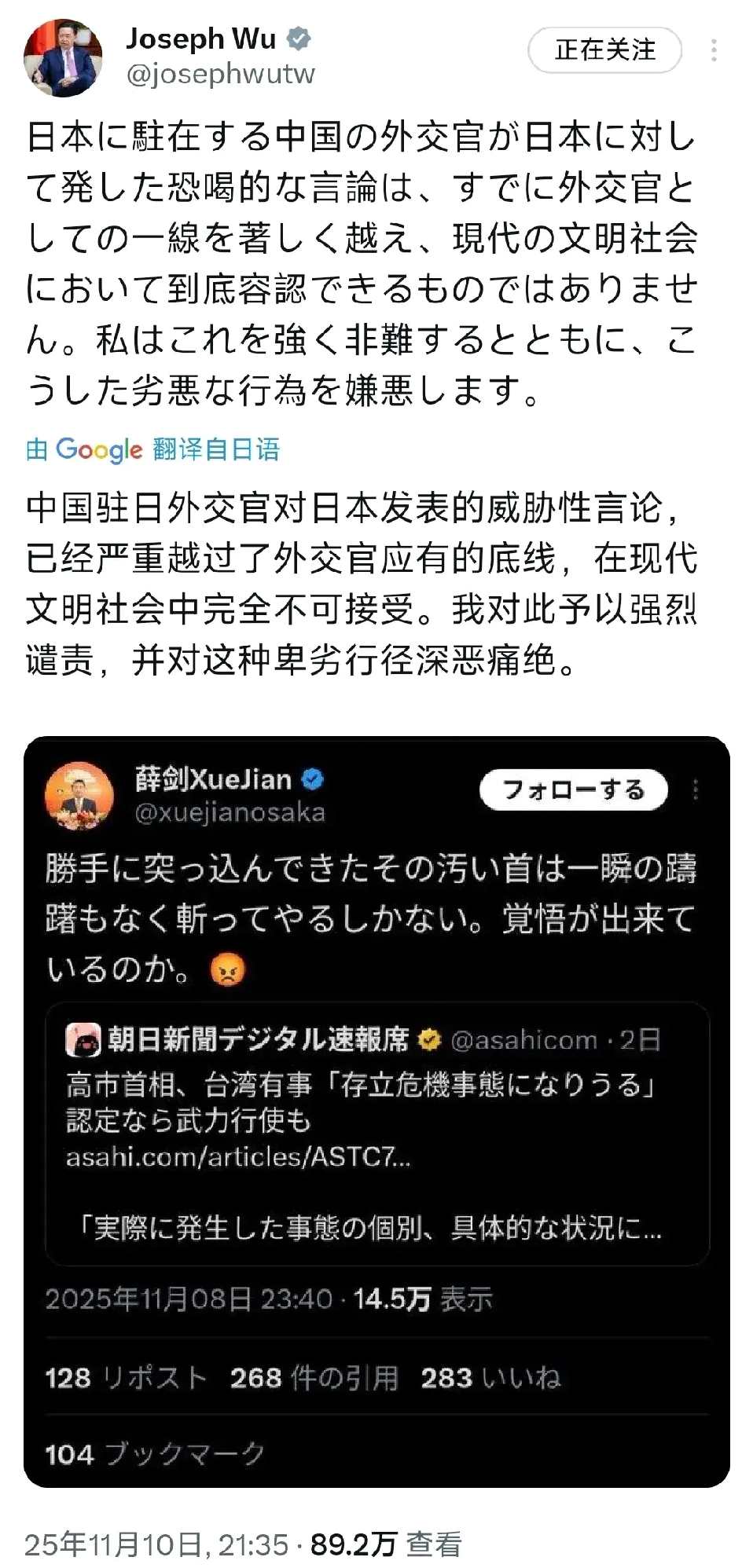 台湾方面反应很大,他们那边的外事部门负责人吴钊燮在11月8号就出来讲话。