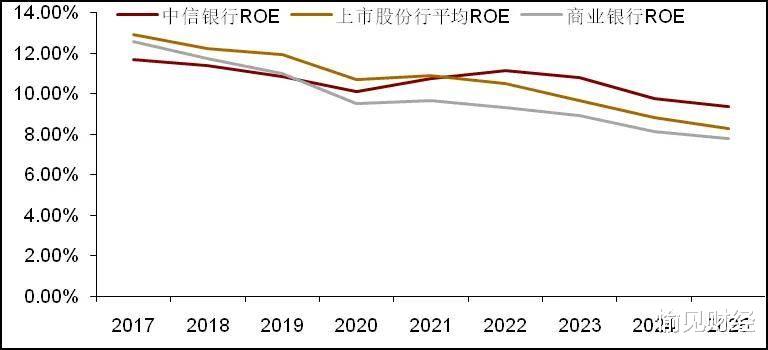 图1:中信银行ROE走势与行业对比。商业银行数据来自国家金融监管总局行业数据统计;上市股份制银行数据及中信银行数据整理自各公司财报。“愉见财经”整理绘制。