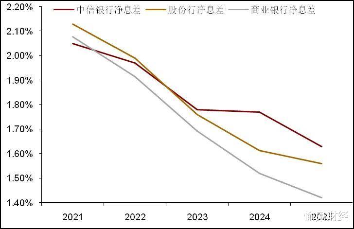 图3:中信银行净息差走势与行业对比。商业银行及股份制银行数据来自国家金融监管总局行业数据统计;中信银行数据整理自公司财报。“愉见财经”整理绘制。