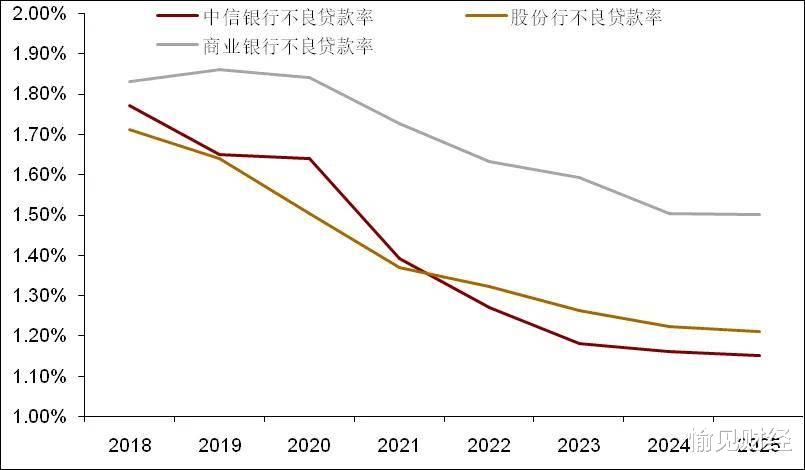 图2:中信银行不良率走势与行业对比。商业银行及股份制银行数据来自国家金融监管总局行业数据统计;中信银行数据整理自公司财报。“愉见财经”整理绘制。