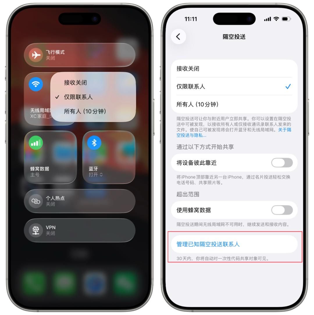 在最新版系统中,主要在 iPhone 设置--通用--隔空投送,新增了 AirDrop 隔空投送联系人功能。该功能单独将陌生人添加到隔空投送列表中,即使对方不是你的通讯录联系人,也可以在 30 天内自由给你发送文件等。但只在 30 天内有效,且只能在 10 分钟内使用。