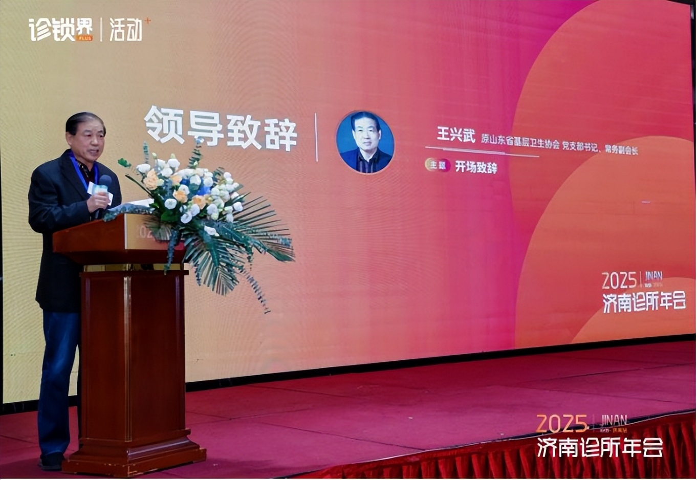 原山东省基层卫生协会党支部书记、常务副会长王兴武致辞。对诊锁界举办的济南诊所年会给予了高度肯定,他认为诊锁界是认清了当前的形势所在,更看清楚了行业转型关键点,把诊所行业志同道合的同仁们聚集在一起,这场年会不是简单的与同行相聚,是一次深度的高价值的行业认知和发展思路的在碰撞,这样的平台对基层医疗来非常难得。他结合近年来委健委发布的数据表示,济南全市基层医疗卫生机构就有超8000家,就像毛细血管一样,扎根在各个社区、乡村,促成了15分钟健康服务圈的网络,形成了居民第一道健康防线。济南诊所从业者没有躺平,而是主动的创新,一批特色专科应运而生。特别是始终聚焦于自费医疗服务的诊所,走出了自己的一条新路。更让人惊喜的是,药店与诊所联动,专科与康复门诊,公立与社会力量协同与跨界融合,正在给基层医疗注入新活力。
