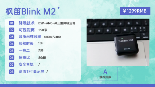 枫笛Blink M2主打一拖二智能收音,30g发射器配磁吸背夹,贴衣领稳固不勾面料,隐蔽性强。TFT触屏操作直观,轻触就能调音量、切降噪模式,冷靴座可直连相机,Type-C接口兼容手机、电脑,3.5mm监听孔能实时排查收音问题,8GB内录功能无惧传输中断,100米开阔地传输稳定。