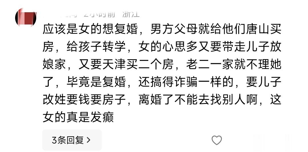 有网友说,女方想复婚,男方父母已经在唐山买房、给孩子转学,结果女方还要求带走儿子放娘家、在天津买二套房,还闹着要儿子改姓要钱,觉得女方像在诈骗,行为太过分。我觉得复婚本应是为了修复感情,一上来就狮子大开口要这要那,确实容易让对方觉得动机不纯。