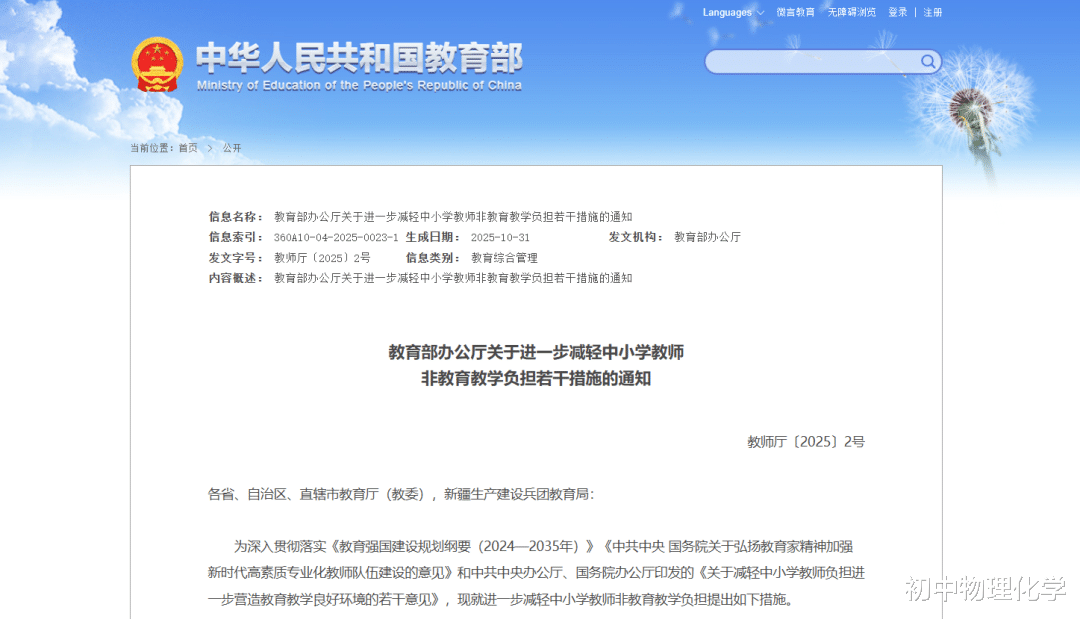 官网发了一份《关于进一步减轻中小学教师非教育教学负担若干措施的通知》。