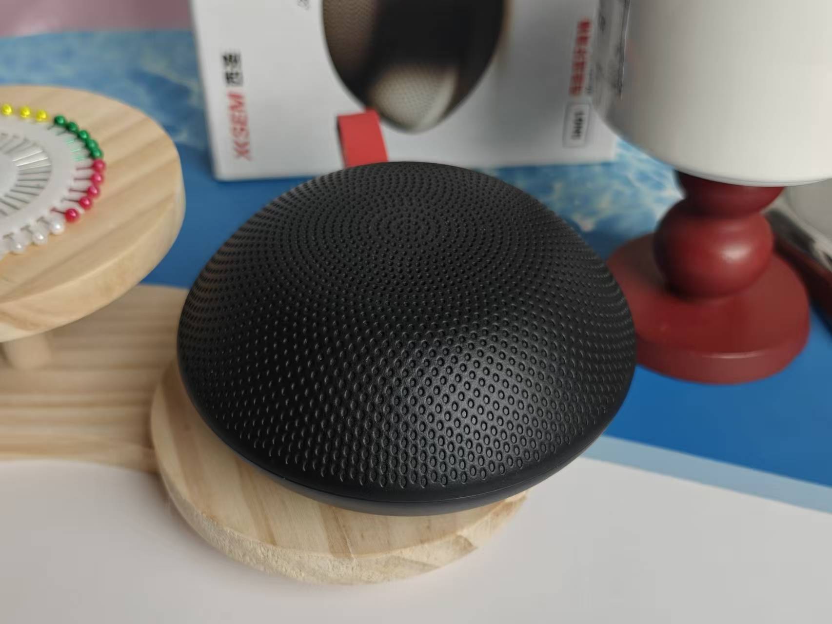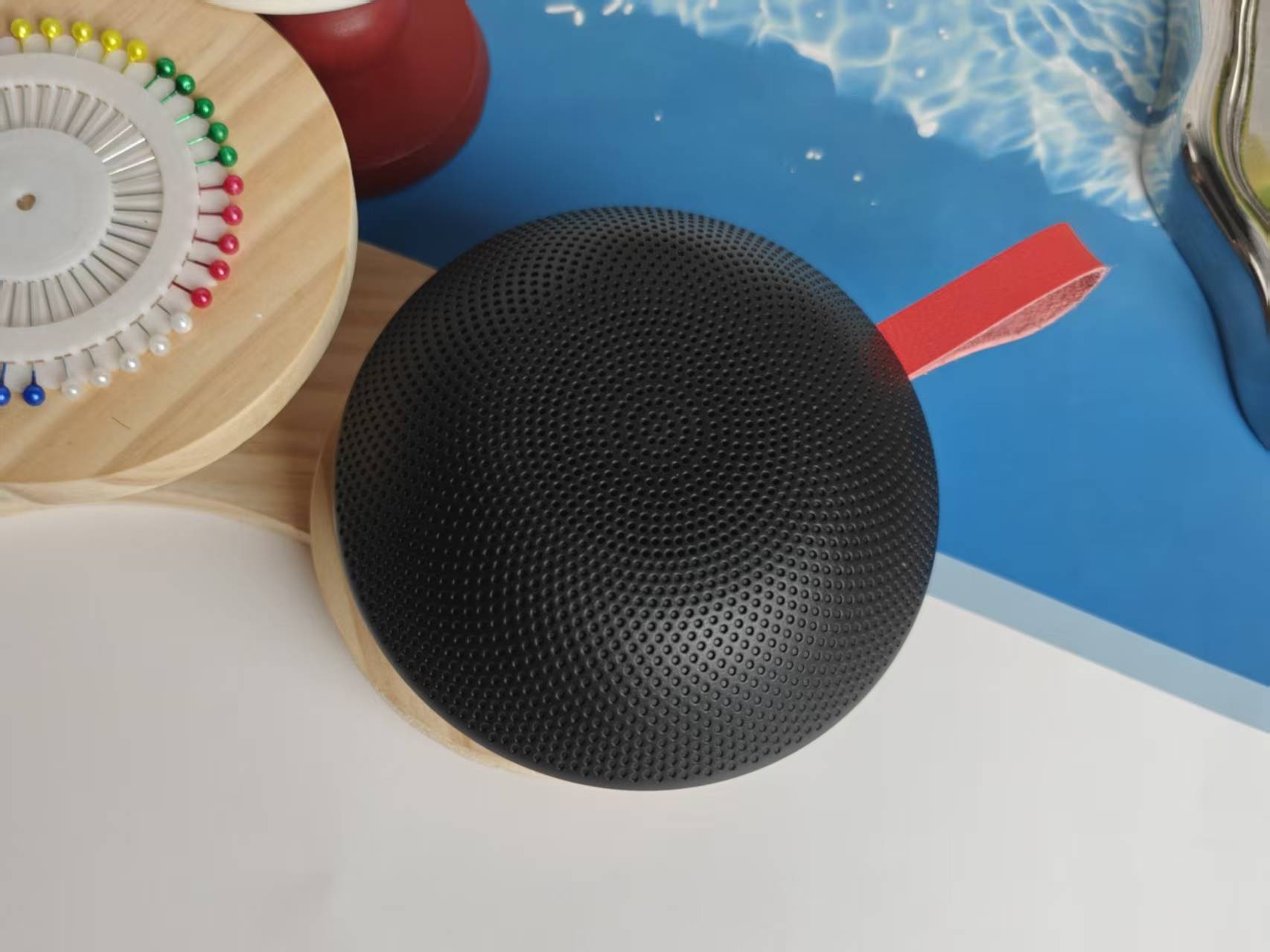 这款音箱采用了圆弧的设计,主体采用纯黑的设计,还配有一根红色的挂绳,显得比较和谐,加上还有硅胶的底座,不管是放桌面还是户外出游,都很合适