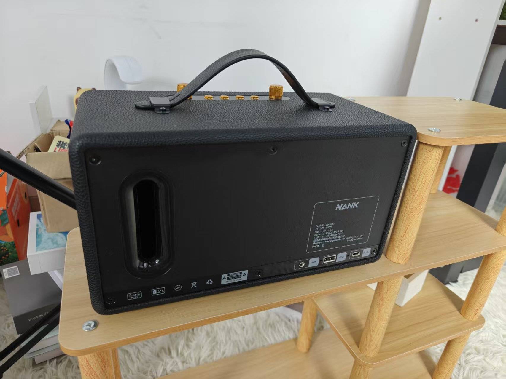 内部配置也非常出色,音量调节方面,它提供了独立的高低音物理旋钮,满足不同用户的听感需求。音响支持 TWS 双机立体声连接,两台音箱可自动分配为左右声道,营造沉浸式空间声场。同时支持 U盘直读与 AUX 音频输入,兼容多种播放设备